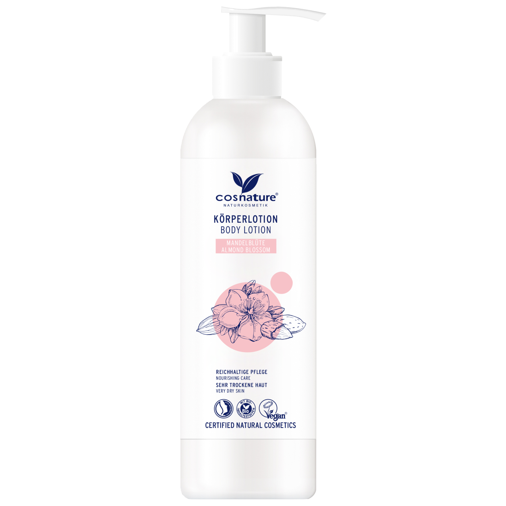 cosnature BODY LOTION ALMOND BLOSSOM enchants with high quality organic almond oil, organic sheabutter and organic blossom extract. The formula intensively nourishes very dry and stressed skin and provides moisture for up to 24 hours without feeling greasy. The sweet almond scent enhances the skincare experience.